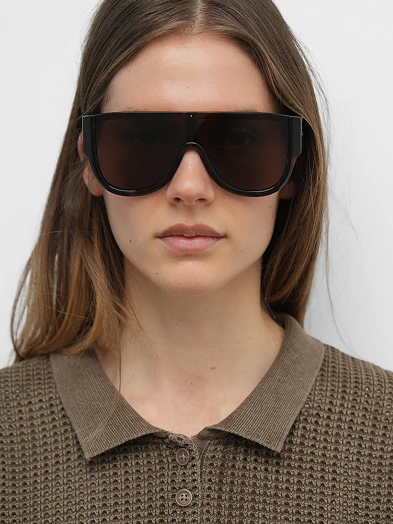 Gafas de sol de máscara extragrandes de acetato del concepto Bustier con superficies biseladas alrededor del borde. Las varillas esculturales caracterizan la construcción, el logotipo de Alaia está gr...
