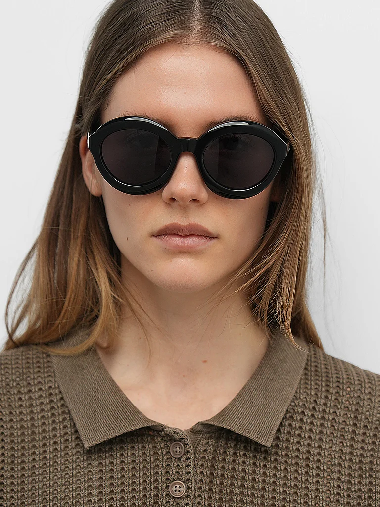 Una forma ovalada que pertenece al concepto Bombè, con superficies y proporciones redondeadas. El logotipo de la escritura Alaia aparece en las finas varillas en grabado láser con adorno de esmalte pa...