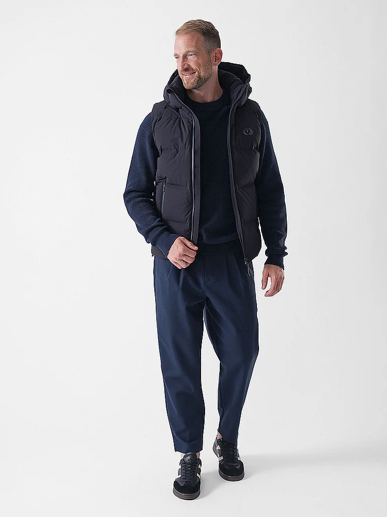 Chaleco acolchado de plumón cálido para hombre, confeccionado con material ligero Capucha acolchada extraíble Cordón Sin mangas Se cierra con cremallera Plumón con certificación RDS Detalle del logo B...