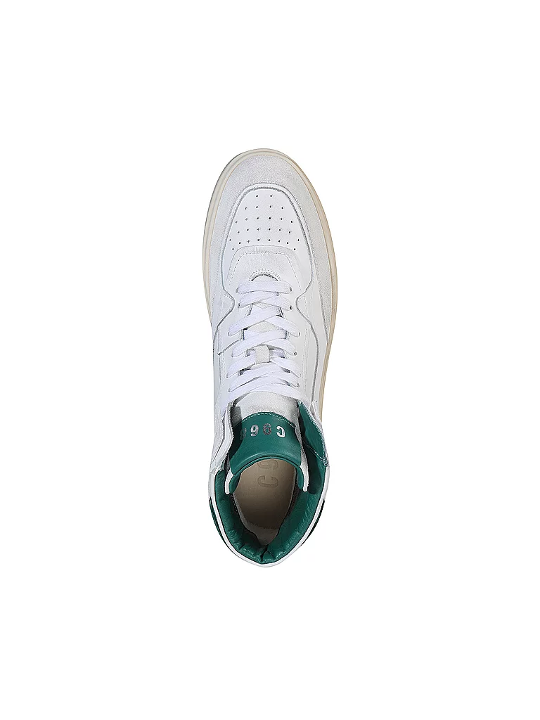 Zapatilla alta de hombre de alta calidad de cuero y ante Caña alta Logotipo grabado en la suela exterior Perforación en la parte delantera Plantilla de cuero Suela de goma Hecho en Italia Detalle de c...