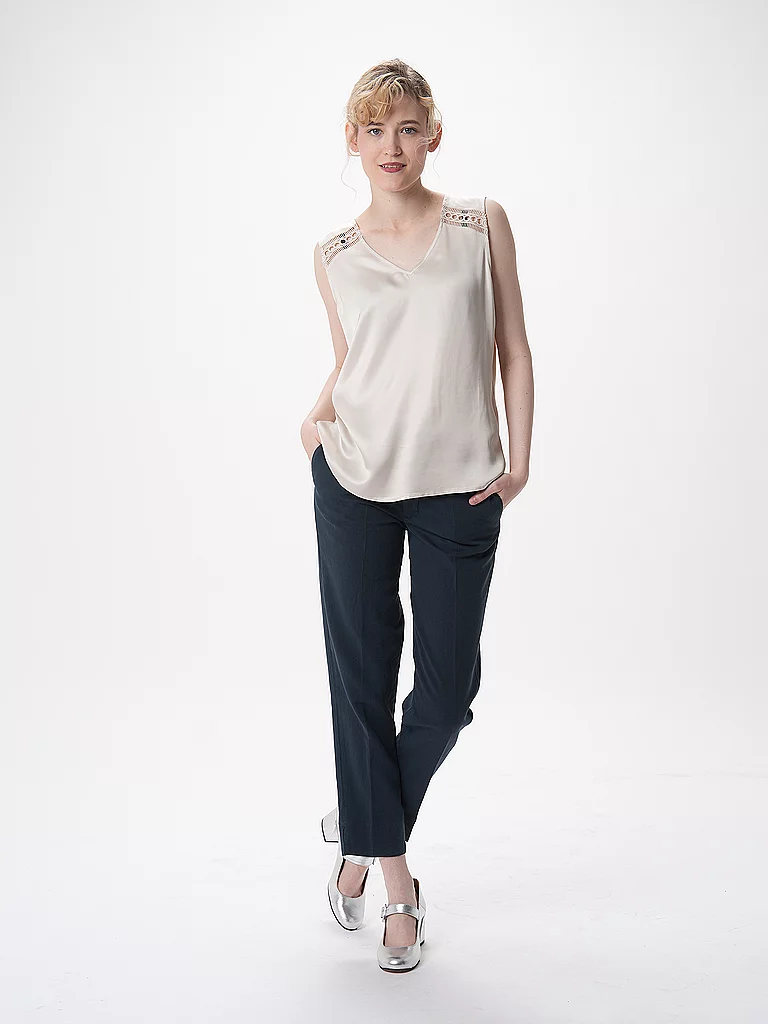 Chino de mujer de mezcla de algodón y lino italiano de alta calidad Cierre oculto Cintura baja Con bolsillos laterales Bolsillos ribeteados en la parte trasera Largo 7/8 Color liso Pierna estrecha Nom...