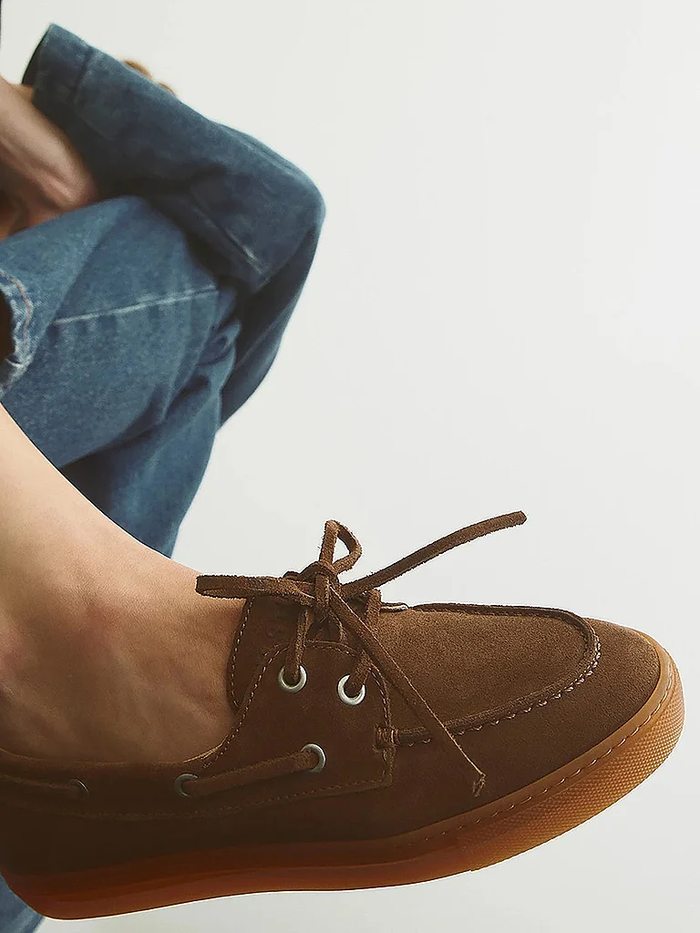 Mocasines de ante suave con una silueta relajada y detalles discretos y minimalistas. Costura decorativa y logotipo en la lengüeta y la plantilla. Diseño sin cordones con cordones decorativos y elemen...