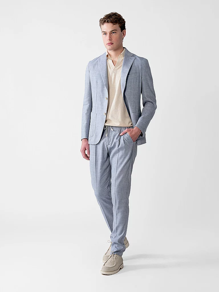 Elegante traje de hombre confeccionado con una mezcla de lana y lino Chaqueta con cuello de solapa Se cierra con dos botones Manga larga Bolsillo ribeteado en el pecho Bolsillos de parche Pantalón de ...