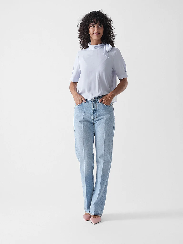 Vaqueros de denim para mujer 100% algodón Tiro medio Estilo 5 bolsillos Pierna recta Bajo ligeramente acampanado Lavado claro Nombre del color: Johanna Material: 100% algodón