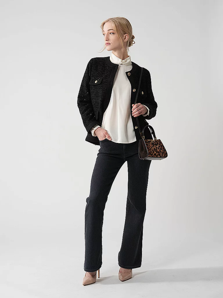 Vaqueros de mujer de algodón elástico Cintura media Se cierra con botón y cremallera Estilo de 5 bolsillos Pernera acampanada Nombre del color: Radio Material: 81% algodón, 11% lyocell, 8% elastano