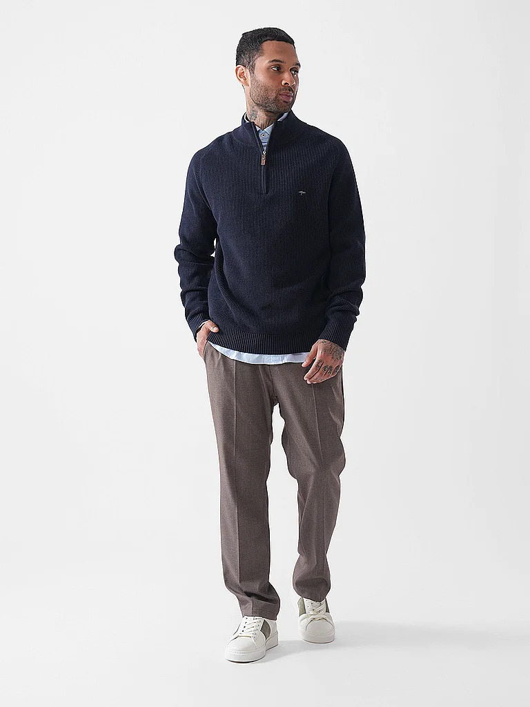 Jersey de punto para hombre Cuello Troyer con cremallera Manga larga Corte cómodo Color liso Detalle del logo Nombre del color: Navy Material: 100% algodón