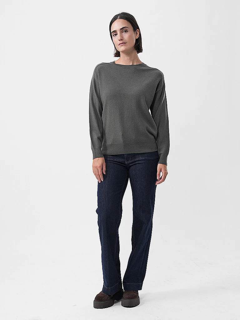 Jersey de cachemira suave para mujer Cuello redondo Manga larga Puños de canalé estrechos en mangas y bajo Corte recto Color liso Nombre del color: Oliva Material: 100% cachemira