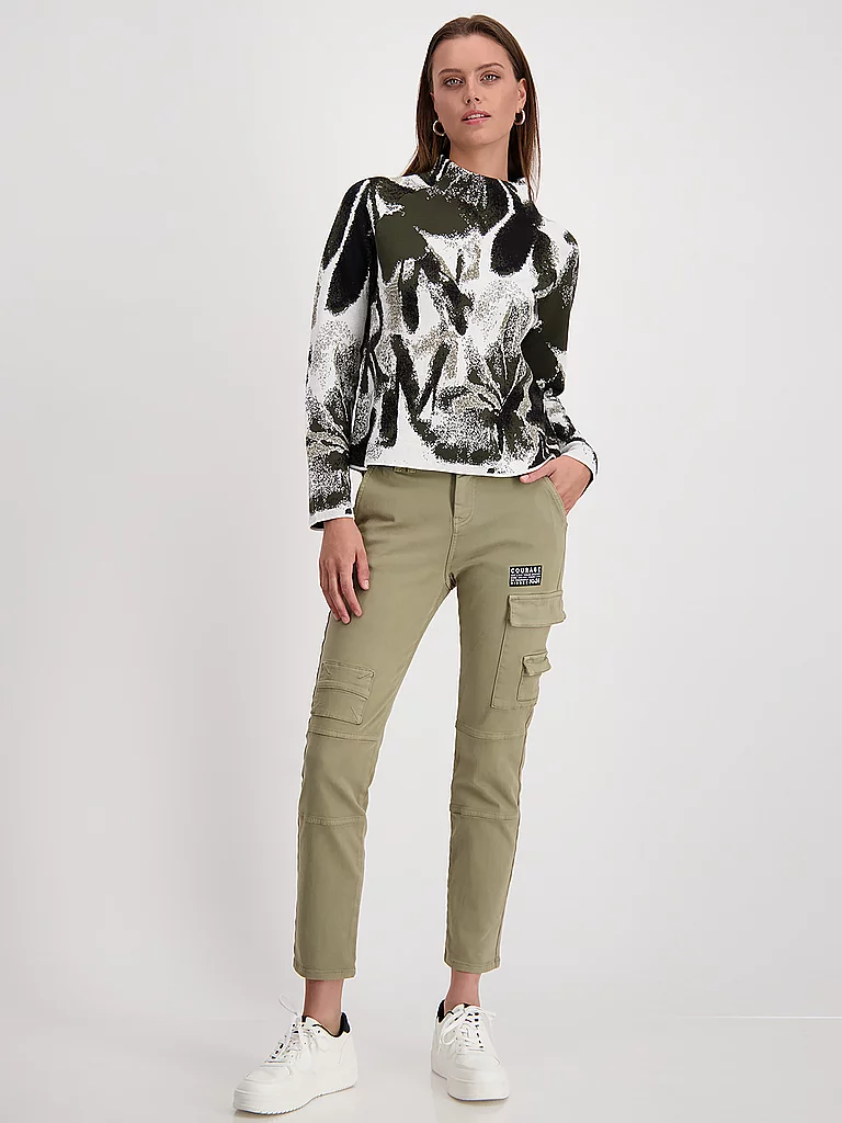 Suéter de punto para mujer hecho de 100% algodón Elegante cuello alto Manga larga Corte recto Estampado floral Nombre del color: Green Tea Gemustert Material: 100% algodón