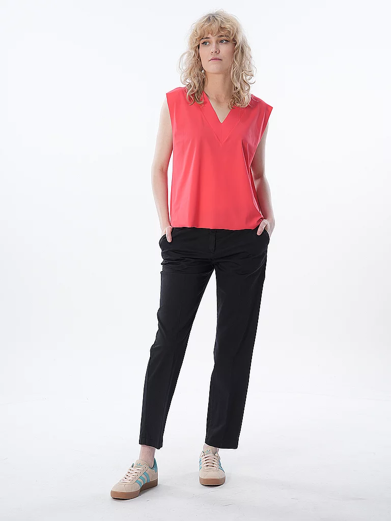Top de mujer de tejido elástico Cuello en V Sin mangas Corte holgado Dobladillos abiertos Parte trasera más larga Color liso Nombre del color: Frambuesa Material: 72% poliamida 28% elastano