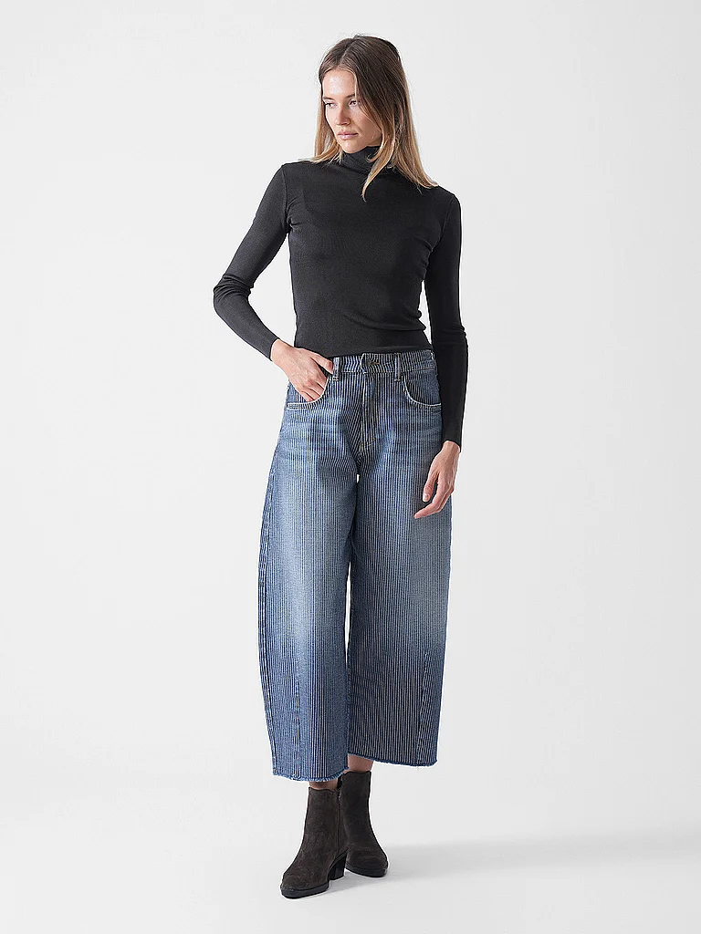 El modelo 05_THE O SHAPE viene en un denim jacquard a rayas y es cómodo de llevar gracias a su bajo contenido de elastano. El aspecto a rayas se complementa con zonas de abrasión claras y buffis incor...