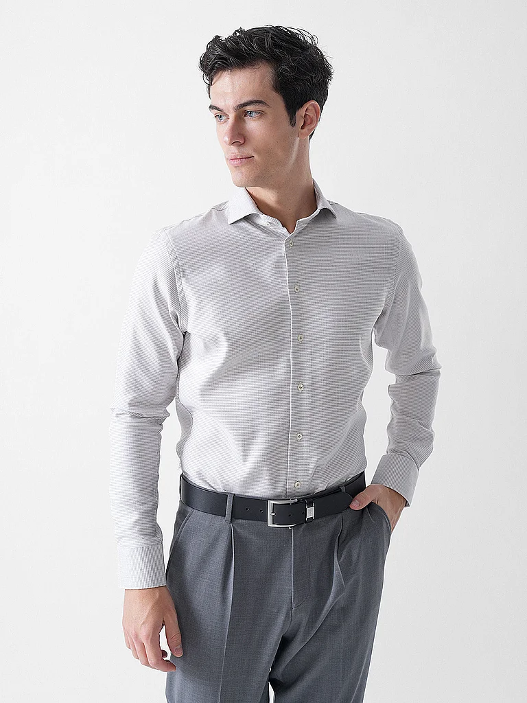 Camisa de hombre de puro algodón Cuello de tiburón Manga larga con puño Corte entallado Se cierra con tapeta de botones Estampado minimalista Denominación del color: Blanco/Bei...