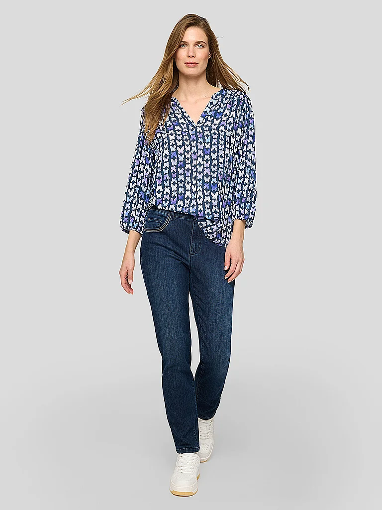 Blusón de mujer de viscosa pura Escote tipo túnica Manga 3/4 Estampado integral Corte holgado Nombre del color: Jeans oscuro Material: 100% viscosa