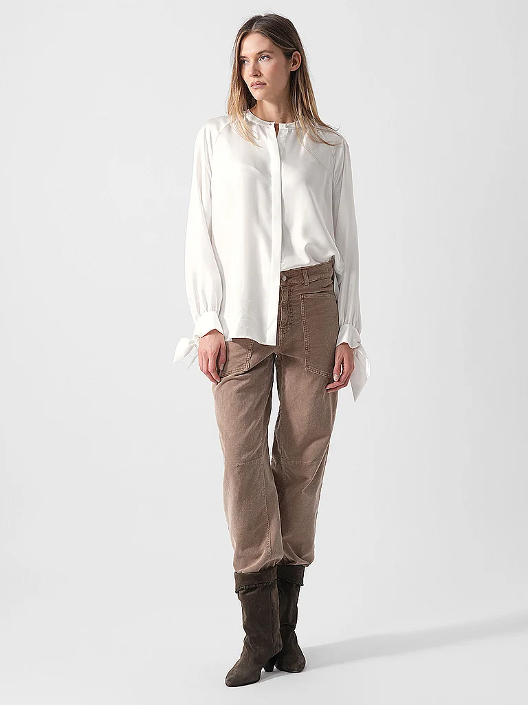Blusa de mujer de seda pura Cuello mao estrecho Manga larga Se cierra con tapeta de botones oculta Puños con cinturón para atar Color liso Corte holgado Denominación del color: Blanco roto Material: 1...