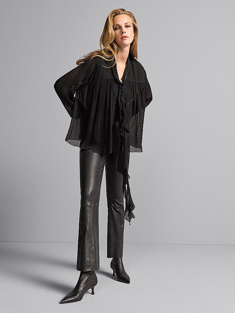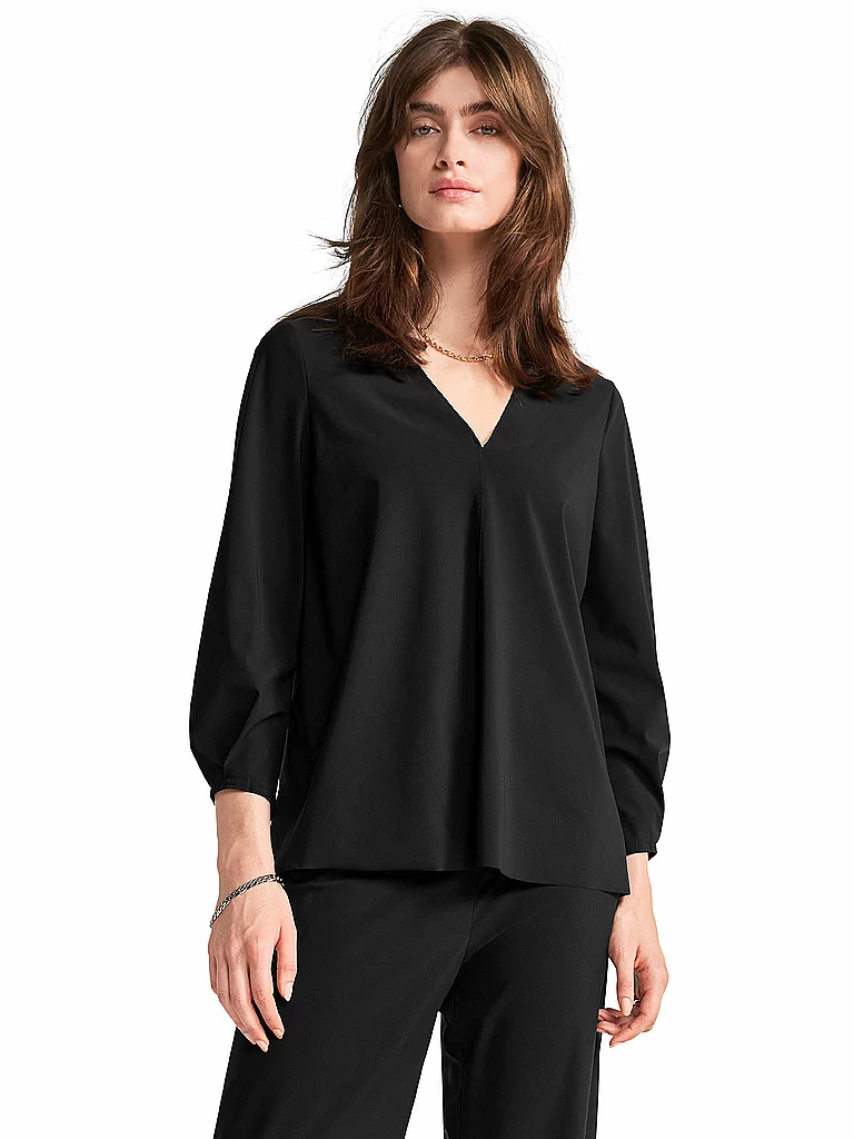 Blusa de mujer confeccionada en material fluido Cuello en V Alto contenido de elástico Manga larga Color liso Corte holgado Denominación de color: Black Material: 68% poliamida 32% elastano