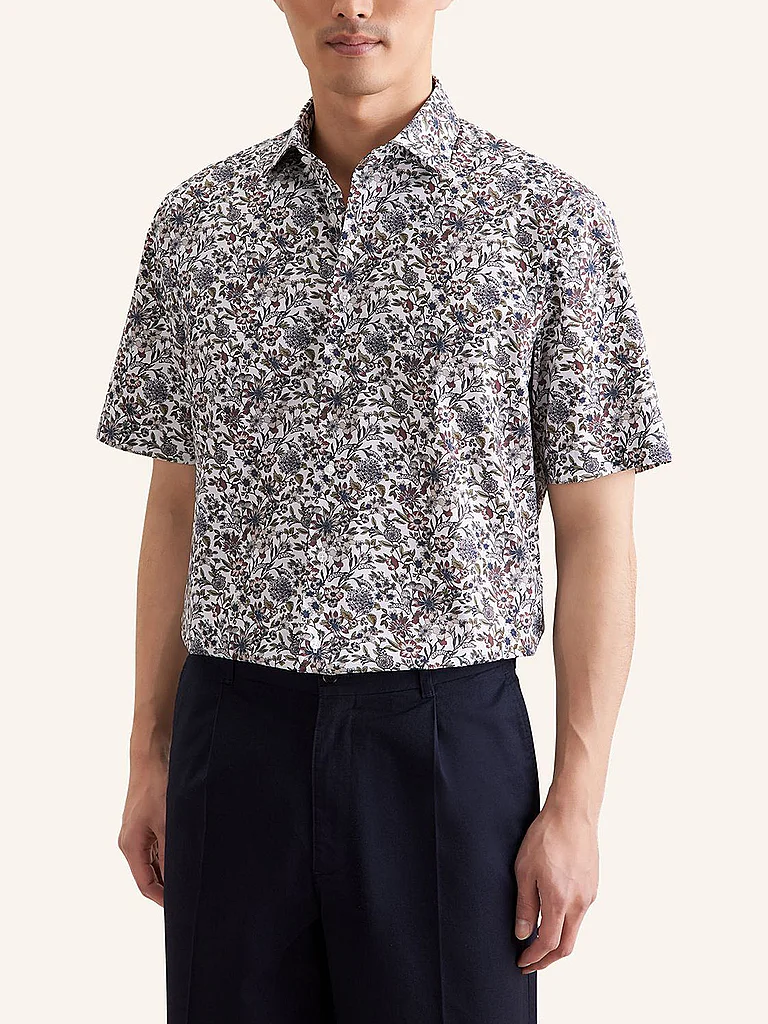 Camisa de hombre de puro algodón Cuello Kent Se cierra con tapeta de botones Manga corta Corte recto Estampado floral integral Denominación del color: Blanco / Azul / Marrón Material: 100% algodón