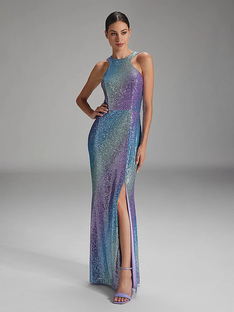 Vestido de noche para mujer de tejido fluido Cuello redondo Se cierra en la nuca con dos botones Abertura en la espalda Sin mangas Lentejuelas de arcoíris Corte entallado Abertura larga en la parte de...