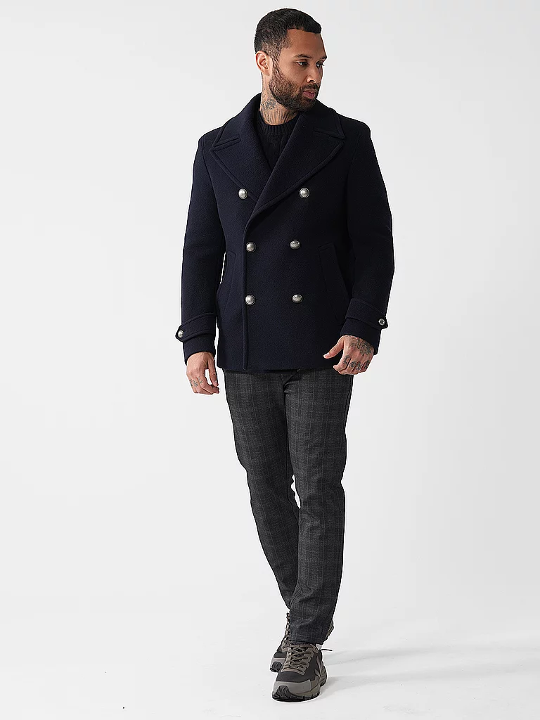 Abrigo de lana para hombre con porcentaje de cachemira Cuello de solapa Manga larga Abotonadura doble Bolsillos laterales Puños Corte regular Denominación del color: Marino Material: 70% lana, 20% pol...