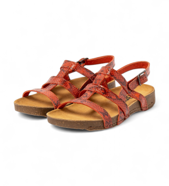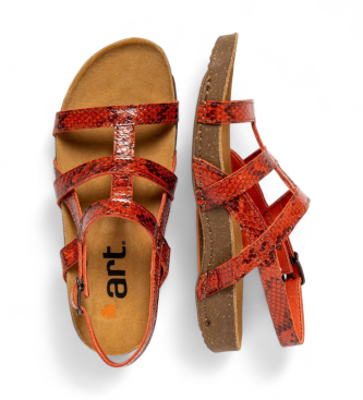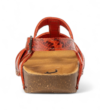Sandalias para mujer de espíritu sport que combinan confort anatómico y una estética natural y sin artificios. El exterior es piel bovina con acabado tipo snake en tono naranja y el forro es de microf...