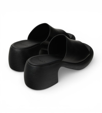 Sandalias negras de piel vacuna para mujer con plantillas OrthoLite Recycled™ y suelas XL EXTRALIGHT EVA. Thelma presenta una elegante combinación de volumen y un tacón curvilíneo con un marcado carác...