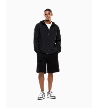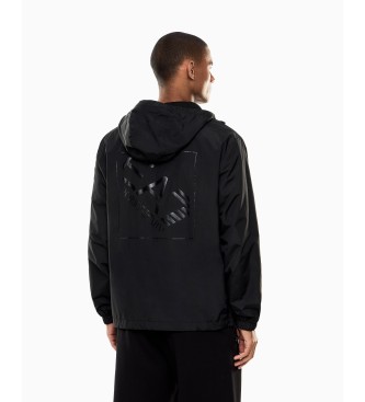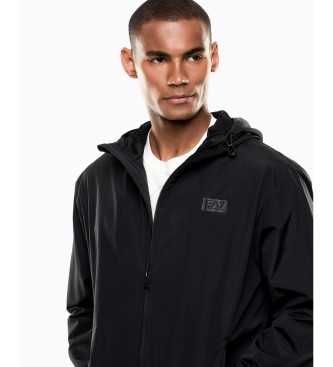 Chaqueta deportiva para hombre de EA7 en color negro. Confeccionada en ligero nylon de 145 gsm, esta prenda ofrece un look moderno y estilizado, perfecto para un estilo casual. Cuenta con capucha ajus...