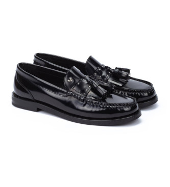 Mocasín clásico de mujer de corte masculino, fabricado 100% en piel vacuno, con el interior forrado en piel y punta redonda. El copete tiene un diseño bicolor con detalle de borlas, que no te dejará i...