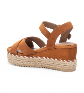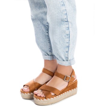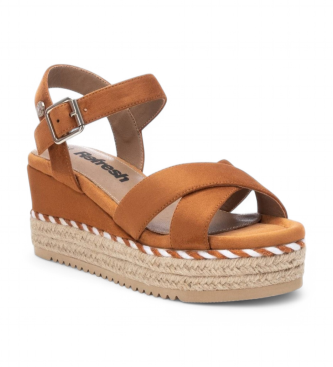 Sandalia de mujer, de la marca Refresh. Fabricada en suave antelina. Pala cruzada y correa al tobillo con hebilla. Cuña de 7 cm forrada de antelina y yute con detalle de cordón bicolor. Suela de goma ...