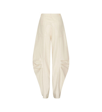 Los pantalones de lino color crema son de color claro, con cinturilla recta y trabillas. Presentan perneras rectas con pliegues visibles en las rodillas, lo que estiliza la silueta. Cuentan con bolsil...