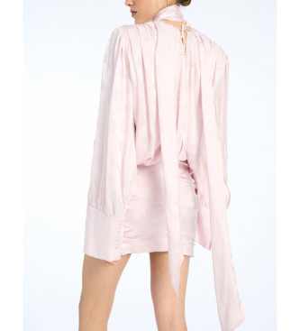 El minivestido Ls Rosa Claro es un vestido mini con mangas largas y voluminosas y puños anchos. Presenta un escote drapeado y un pañuelo largo que se extiende desde el cuello. Los laterales están frun...