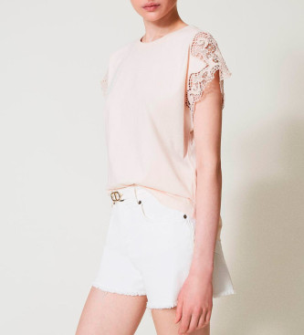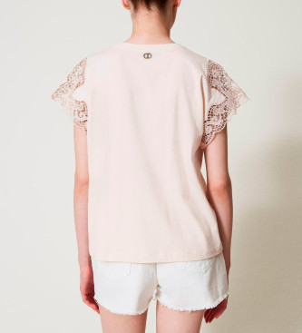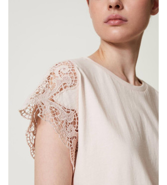 Twinset para mujer. 251TP2290 Camiseta estándar con encaje beige (L), Casual, Algodón, Manga corta