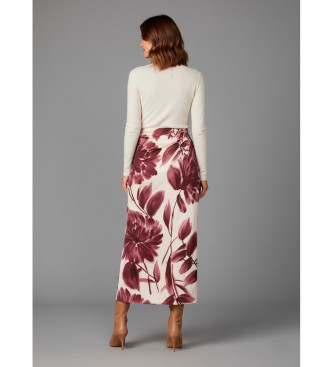 La falda de Twinset combina un aire romántico con un diseño versátil perfecto para cualquier ocasión. Confeccionada en tejido ligero, luce un delicado estampado floral en tonos burdeos sobre fondo bla...