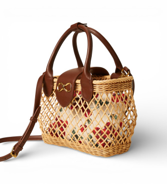 Bolso bandolera con diseño de canasta de mimbre trenzado a mano en color natural. En el interior hay un bolso de mano extraíble de lona estampada con estampado de la colección. Presenta doble asa de m...