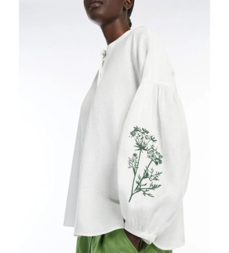 Camisa confeccionada en tela de lino puro, caracterizada por el volumen amplio y la manga larga con sisa caída y adornada con motivo bordado en contraste en el bajo. El modelo presenta cuello mao, puñ...