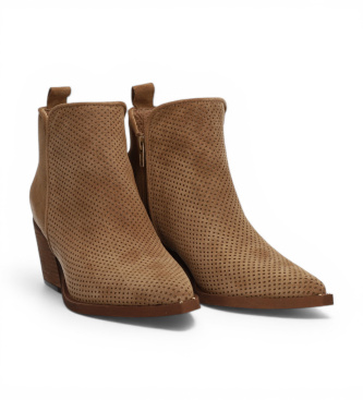Botín de ante perforado en tono camel con tacón alto de bloque y puntera puntiaguda, una pieza que combina la elegancia western con un carácter moderno y versátil. Su textura perforada all-over aporta...