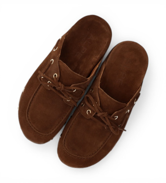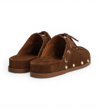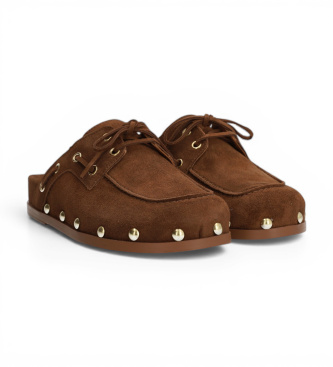 Mule tipo zueco en ante marrón tabaco con tachuelas doradas y cordones, una pieza que fusiona la comodidad del calzado abierto por detrás con un diseño cargado de personalidad y referencias bohemias. ...