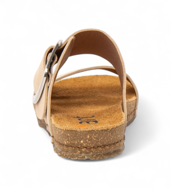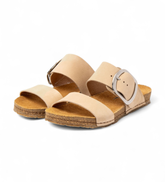 Sandalias pensadas para mujer que combinan sencillez y confort. Su exterior en piel bovina en tono beige se apoya sobre una suela de caucho natural y corcho reciclado que aporta amortiguación y una pi...