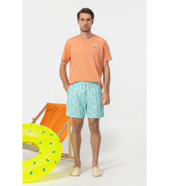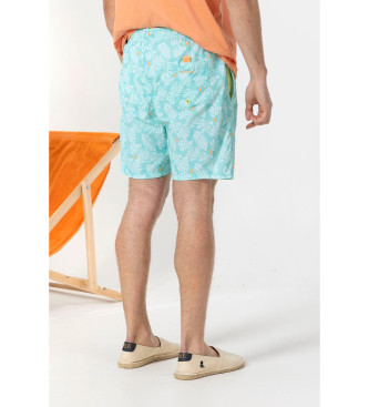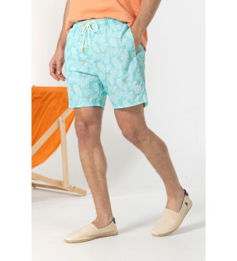 Detalles del producto: Bañador con estampado siluetas hojas en color azul turquesa. Composición exterior 100% poliamida y forro 100% poliéster. Bolsillos delanteros y bolsillo trasero derecho con det...