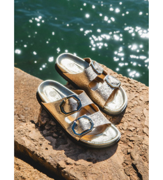 Sandalia metalizada dorada con planta anatómica. Ajustable con nuestra exclusiva hebilla GENUINS. PETA vegan approved. Diseñado y fabricado en nuestras fábricas de Elche, bajo una producción sostenibl...
