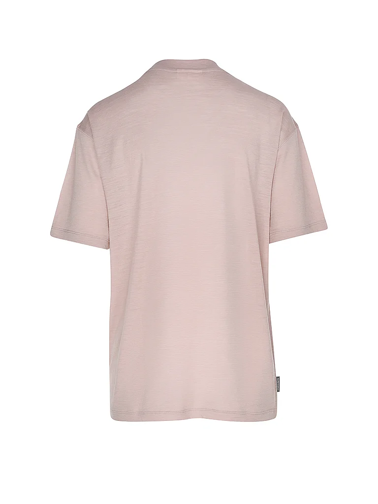 Camiseta funcional de mujer Cuello redondo Manga corta Hombro caído Corte holgado Estampado en el pecho Color liso Material: 100% lana merino Nombre del color: Pink Quartz
