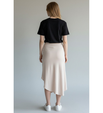 Falda midi en tono crema con abertura frontal envolvente, una pieza elegante y femenina que combina la sencillez de las líneas limpias con el detalle diferencial de su bajo asimétrico. Su tejido fluid...
