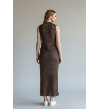 Vestido largo de punto calado en tono marrón oscuro con destellos de lentejuelas, una pieza sofisticada y con mucho carácter que combina la artesanía del tejido calado con el brillo sutil de las lente...