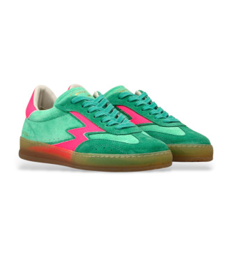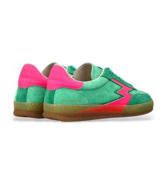 Zapatillas bajas de mujer en color verde matcha fabricadas en Italia en ante, con detalles y logotipo en piel engomada de color fucsia. - Logotipo de piel engomada de color fucsia - Lengüeta de ante v...