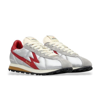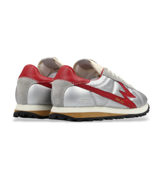 Sneakers unisex de perfil bajo en nylon plateado, con detalles en piel rojo intenso y ante gris. Un diseño llamativo que combina acabados modernos con una silueta deportiva clásica. Empeine en nylon p...