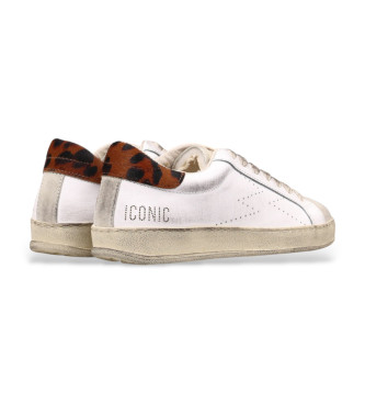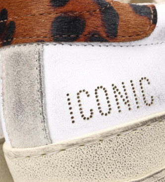 Sneaker baja de mujer, fabricada en Italia en piel sintética con acabado efecto sporcato. Presenta un diseño moderno con logo perforado en el lateral y la palabra "ICONIC" troquelada, combinados con u...