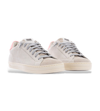 El John Calypso está revestido de ante perforado beige con un refuerzo del talón de ante rosa fluorescente en contraste. Cordones y suelas de algodón gris completan el conjunto. Hecho en Italia Parte ...