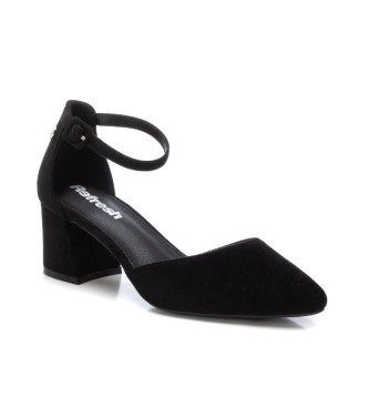 Zapato de mujer, de la marca Refresh. Fabricado en suave antelina. Zapato de salón destalonado con elegante punta afilada. Cierre mediante correa con hebilla al tobillo. Tacón ancho de 6 cm forrado en...