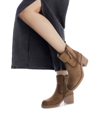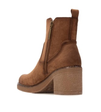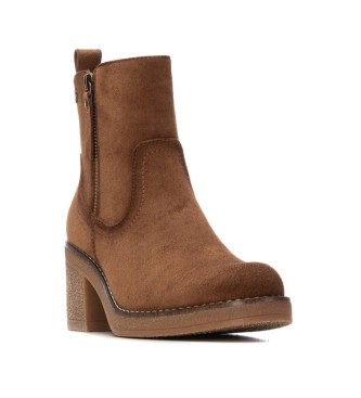 Botines de mujer de la marca Refresh, confeccionados en suave antelina en color marrón. Diseño con cierre mediante cremallera interior y cremallera lateral decorativa. Incluyen un tirador trasero para...