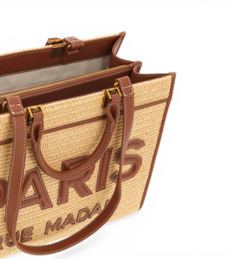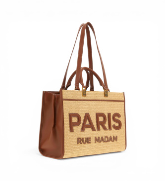 Bolso tote de paja con laterales y detalles de piel sintética, con logotipo PARIS acolchado y costuras en contraste, asas de piel sintética con detalles metálicos del logotipo en tono dorado envejecid...