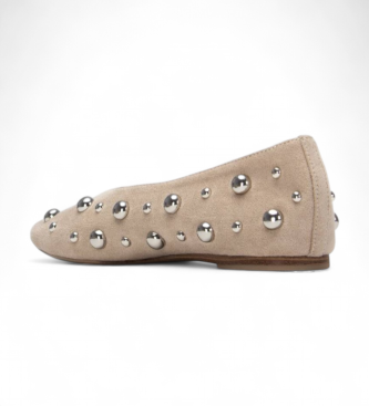 Bailarina plana para mujer en tono marrón, realizada en suave antelina y decorada con tachuelas redondas de distinto tamaño que recorren el diseño. Su línea baja y su suela plana garantizan comodidad ...