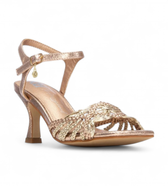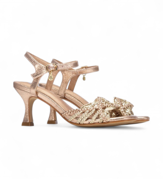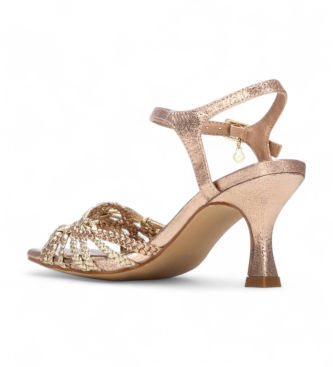 Sandalia para mujer en marrón con efecto metalizado, confeccionada en material sintético que imita la piel. Su pala trenzada aporta textura y un detalle artesanal, mientras que la pulsera con hebilla ...