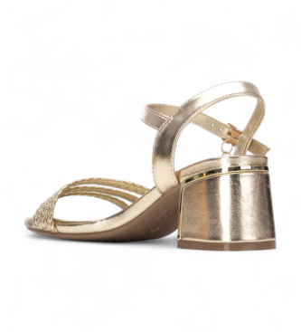 Sandalias de mujer en tono dorado con un acabado metalizado que refleja la luz con discreción. Están fabricadas en material que imita la piel (sintético) y presentan una pala formada por tres tiras tr...